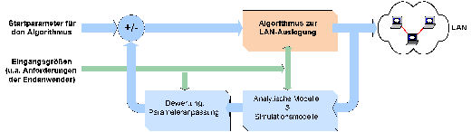 Zunächst wurden die Aufgaben der LAN-Auslegung sowie die Einflussfaktoren auf die Auslegung nochmals ausführlich untersucht. Bereits aus den dabei angestellten Überlegungen resultieren grundlegende Entwurfsentscheidungen für den Auslegungs-Algorithmus. Als Rahmenbedingung wurden dementsprechend die Strukturierte Verkabelung und der Einsatz von Ethernet als Gebäudetechnologie festgelegt. Zusätzlich wurde die Einteilung eines Netzwerkes in verschiedene Netzfundamente mit in den Algorithmus-Entwurf übernommen.